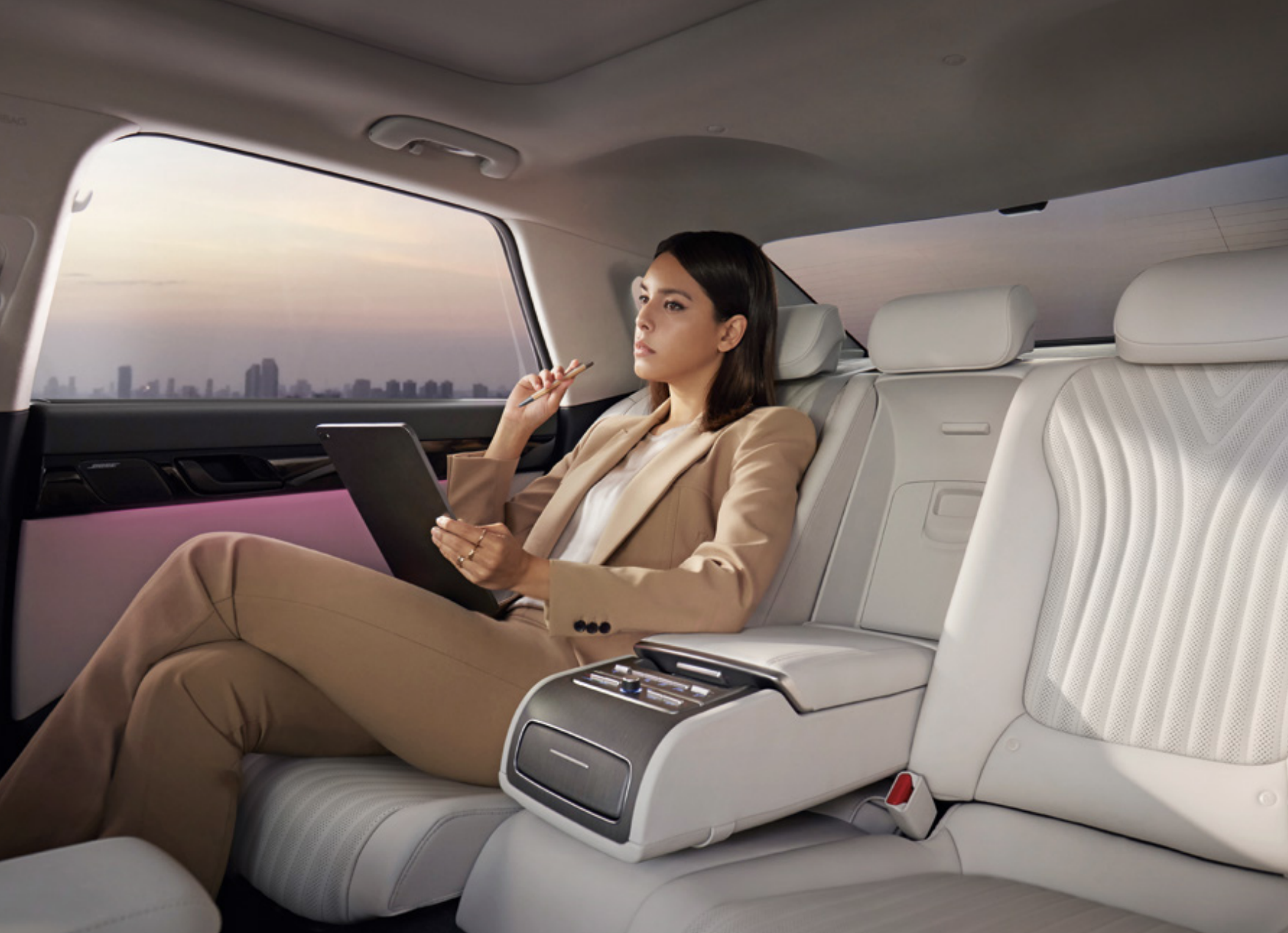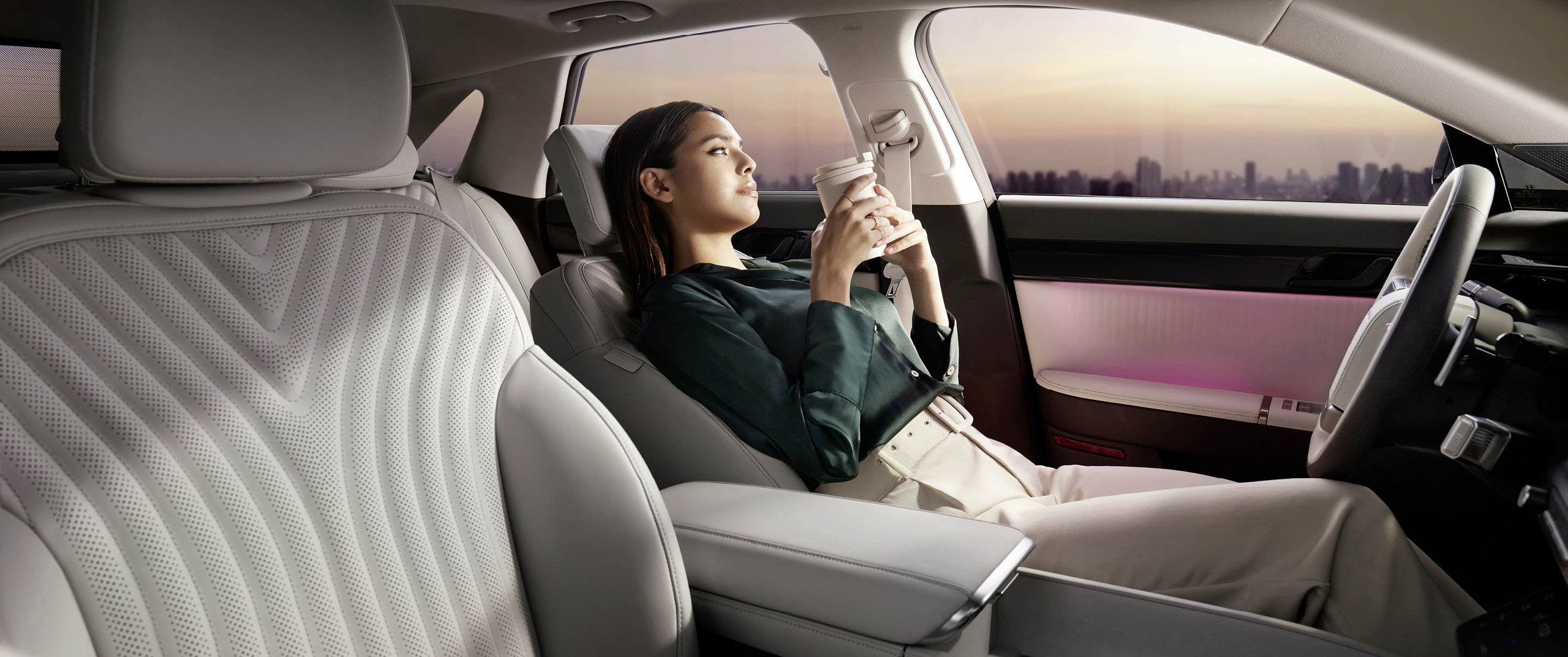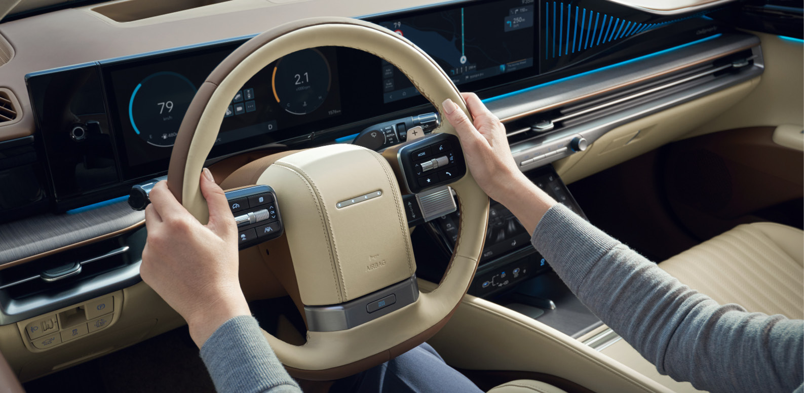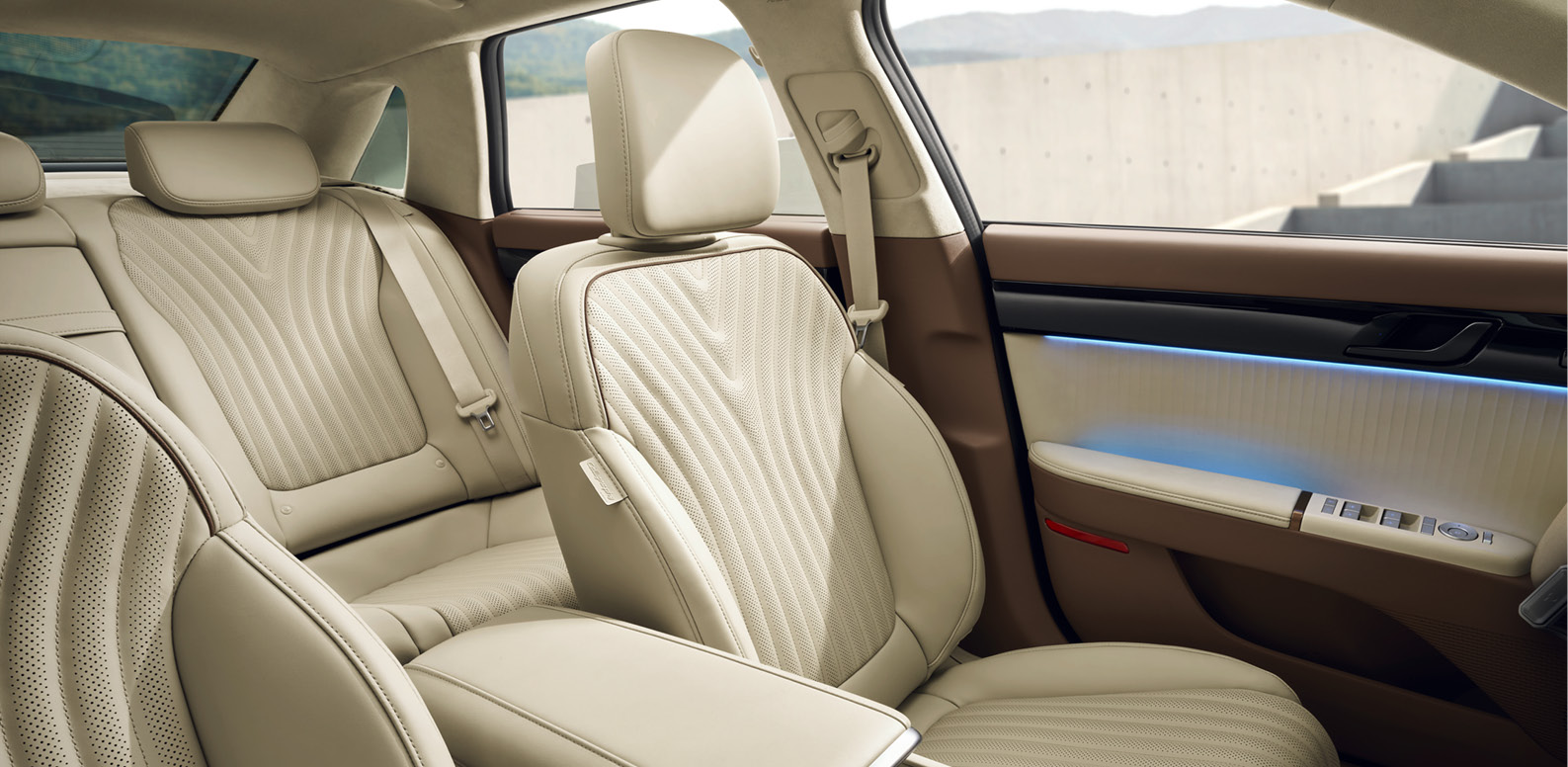 2025년형 신형 그랜저의 인테리어 입니다. 탑승자를 편안하게 감싸는 랩 어라운드(Wrap-around) 구조와 프리미엄 리얼 소재가 아늑하고 고급스러운 공간감을 연출 합니다.