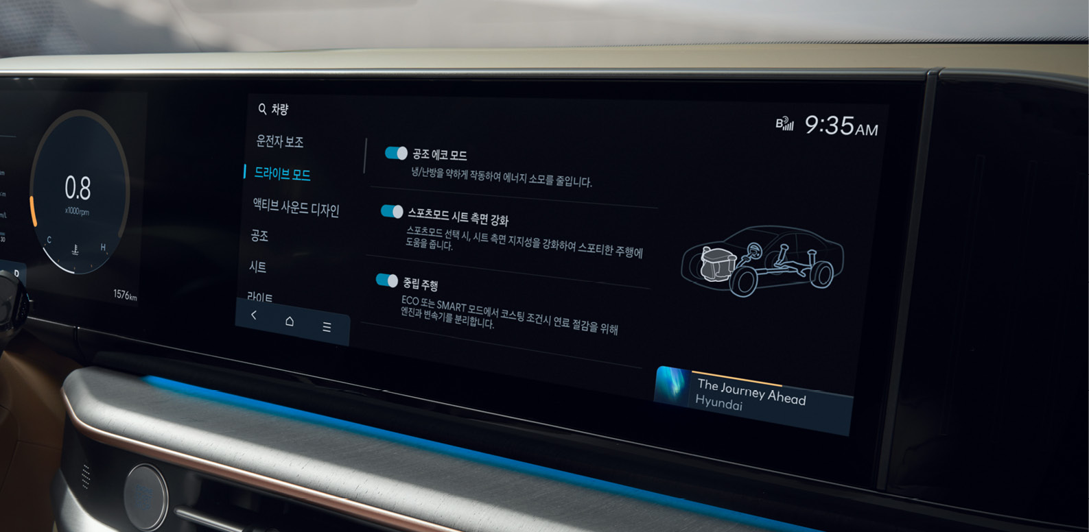 - 스티어링 휠의 드라이브 모드 버튼을 조작할 때마다 모드별로 다른 무빙과 컬러가 연출됩니다.