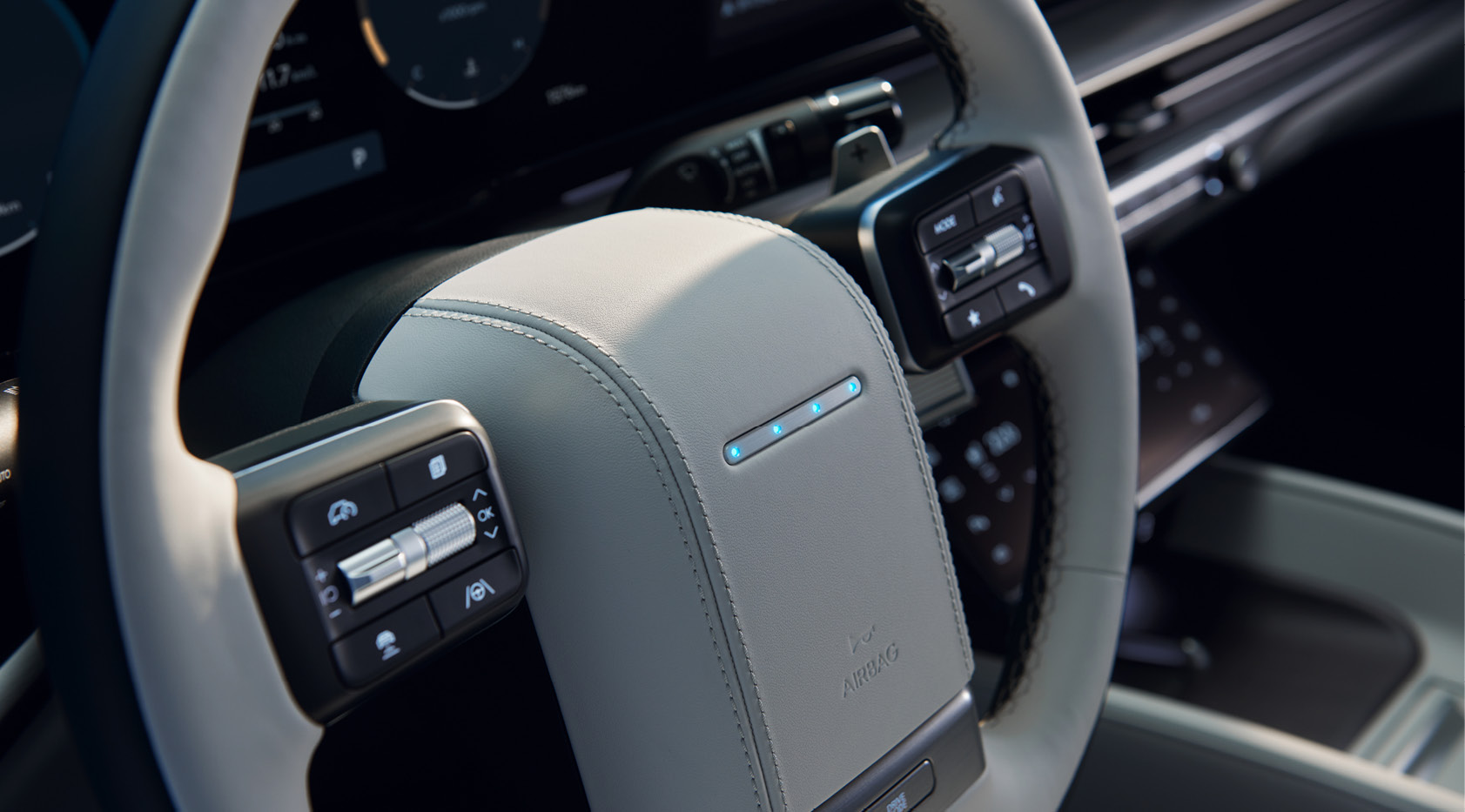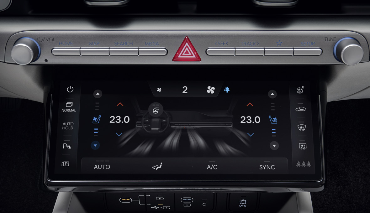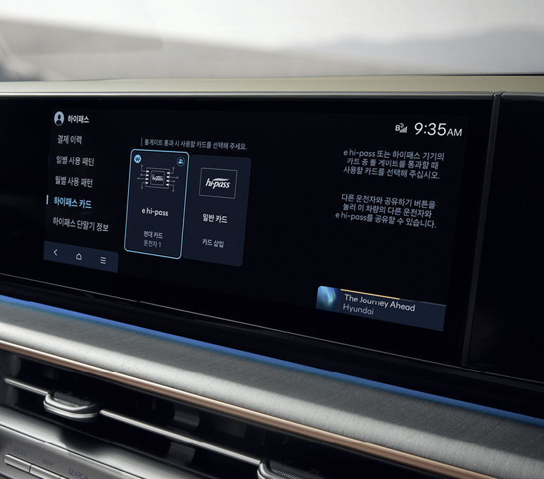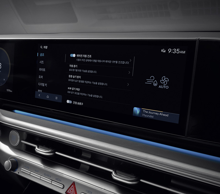 풀터치 기능이 가능한 대화면 통합 공조 컨트롤러를 통해 주차 관련, 시트 열선/통풍, 스티어링 휠 열선 등의 다양한 기능을 터치 방식으로 통합 제어할 수 있습니다. 개인의 사용 패턴에 맞춰 노말 테마, 심플 테마, 커스텀 테마 모드로 선택 가능합니다차량 내 간편 결제나 발레 모드 해제 시 필요한 인증 기능을 수행하고 지문 인식만으로 차량의 시동과 주행이 가능합니다.