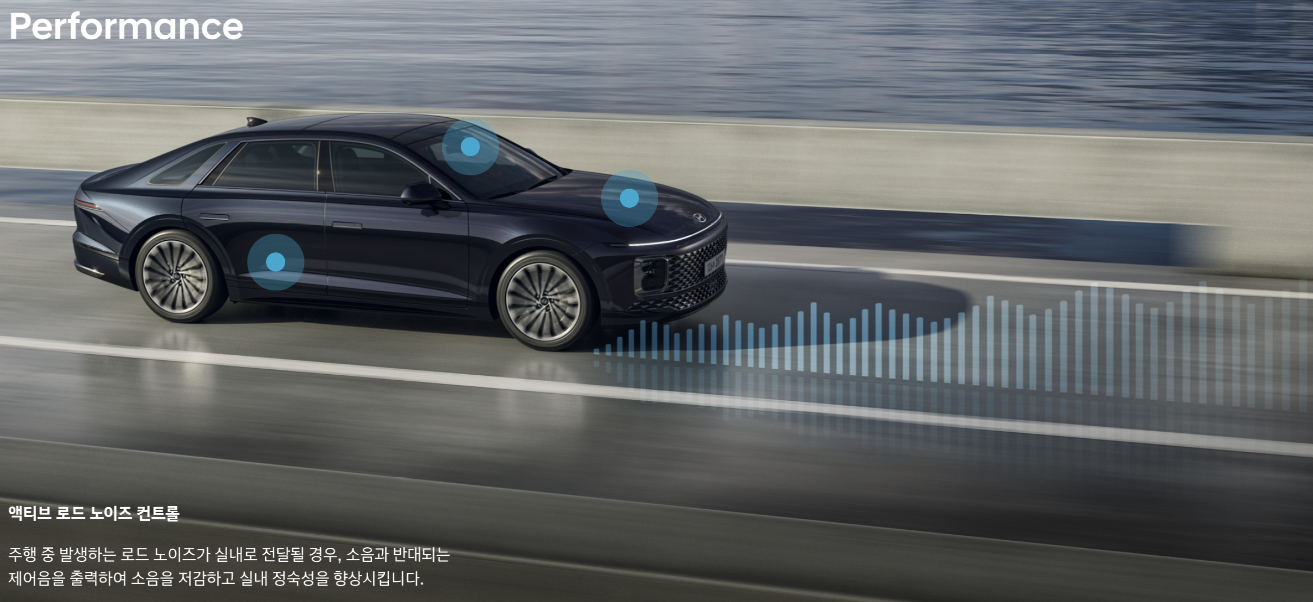 주행 중 발생하는 로드 노이즈가 실내로 전달될 경우, 소음과 반대되는 제어음을 출력하여 소음을 저감하고 실내 정숙성을 향상시킵니다.