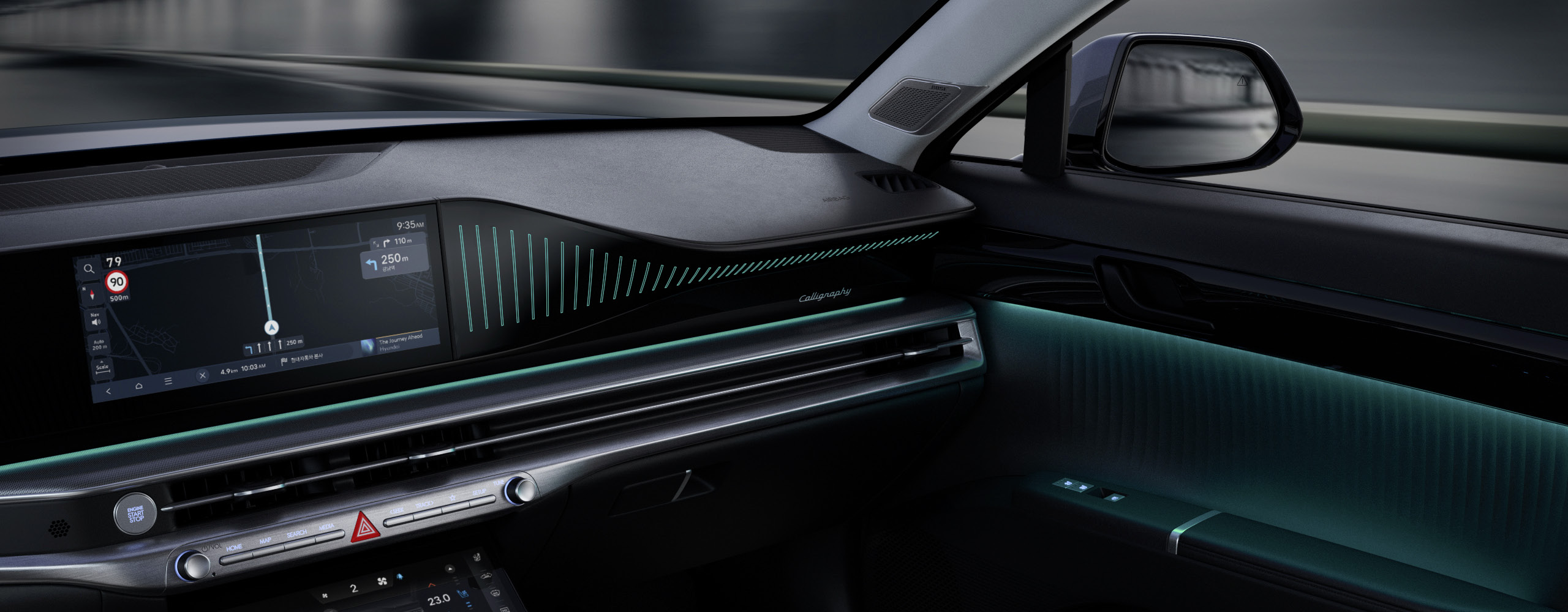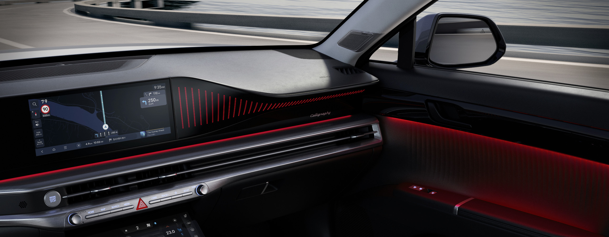 파노라믹 디스플레이로 클러스터, 내비게이션, 헤드업 디스플레이 간 일체감 있는 그래픽 테마를 구현하고, 자연어 기반 음성인식, 미디어 스트리밍, 실시간 길 안내 등의 다양한 콘텐츠를 제공합니다.
