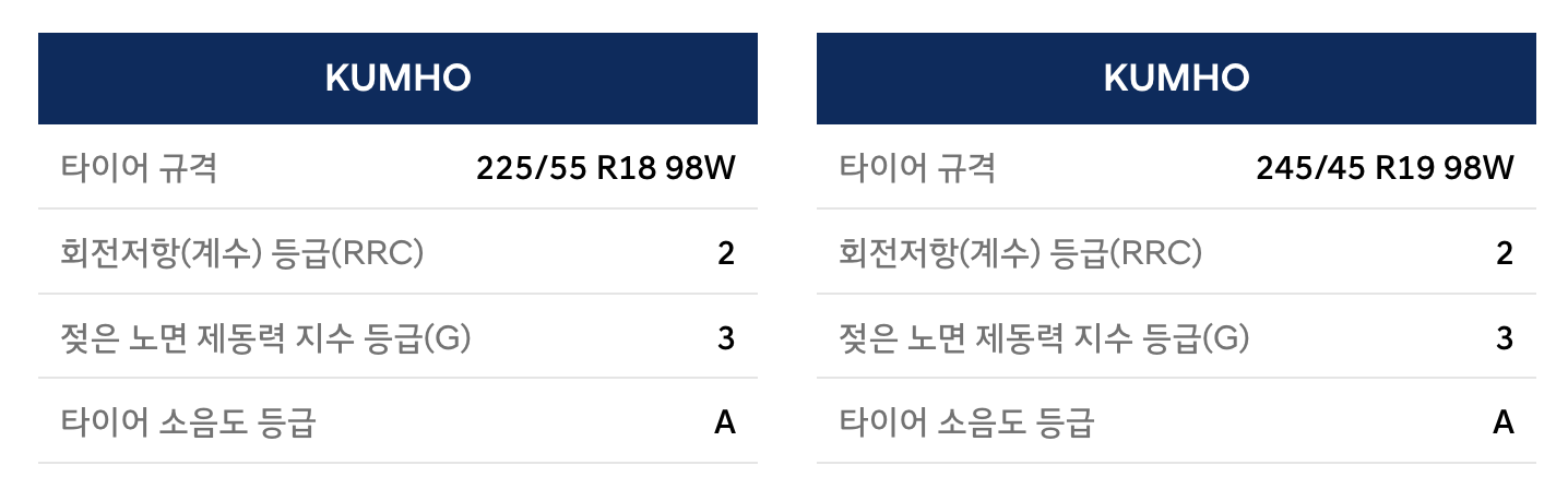 - 타이어 사이즈가 동일하더라도 효율 등급 및 소음도 등급이 다를 수 있습니다. 또한 일부 정보가 사전통보 없이 변경될 수 있습니다.