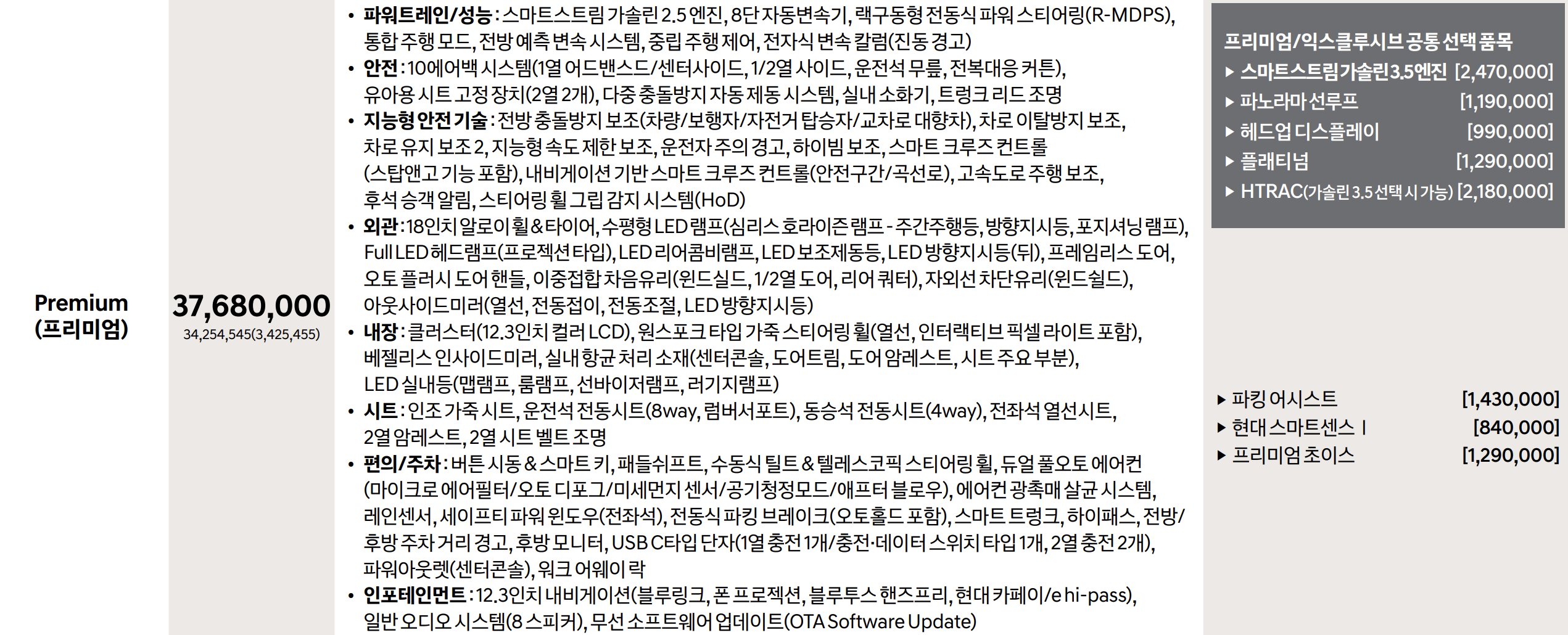 2025 그랜저의 시작 등급인 프리미엄 트림은 37,680,000원 부터 시작합니다.